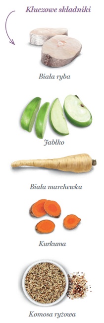 świeżo przygotowana biała ryba 70% (używamy 140 kg świeżo przygotowanej ryby do wyprodukowania 100 kg naszego produktu), cały zielony groszek, białko ziemniaczane, brązowy ryż, mączka chleba świętojańskiego, hydrolizat rybny, drożdże (Saccharomyces cerevisiae), białko grochu, błonnik jabłkowy 13000 mg/kg, nasiona lnu (naturalne źródło kwasów tłuszczowych omega 3), minerały, tapioka, olej rybi (chroniony naturalnymi tokoferolami), psyllium, odwodniona dynia, odwodniony jarmuż, kryl antarktyczny, wodorosty kelp, spirulina, komosa ryżowa 1 000 mg/kg, biała marchew 1000 mg/kg, cykoria (źródło FOS) 1 000 mg/kg, hydrolizowana ściana komórkowa drożdży (źródło MOS) 1 000 mg/kg, ekstrakt z mandarynki, imbir, kurkuma 500 mg/kg, rozmaryn, yucca schidigera.