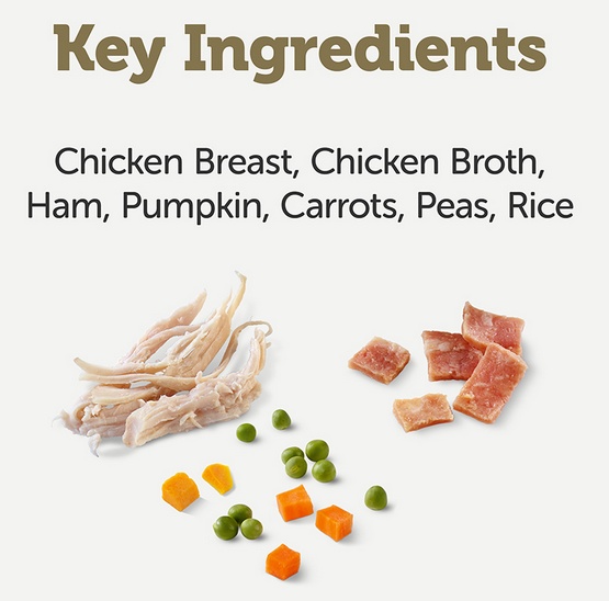 Pierś z kurczaka 28%, bulion z kurczaka, szynka 15%, dynia 8%, marchewka 8%, groszek 8%, ryż