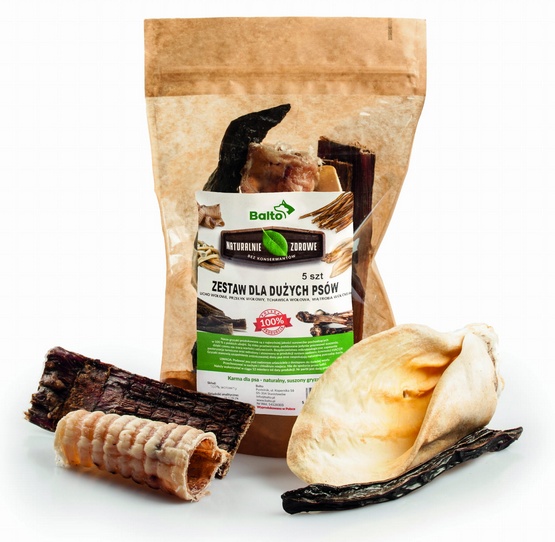 W skład zestawu wchodzą takie wołowe rarytasy jak: ucho wołowe, tchawica wołowa, przełyk, wątroba – łącznie aż 5 sztuk!