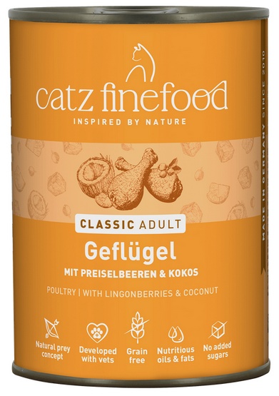 Specjał dla kotów – wartościowa karma dla naszych pupili. Catz finefood N°3 zawiera dużo delikatnego drobiu oraz zdrowe dodatki, jak borówka i mniszek lekarski. Bez konserwantów, barwników i wzmacniaczy smaku. Nie zawiera GMO. Mmmmiau!