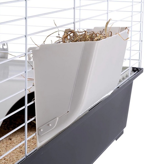 Klatka jest przewidziana dla królików lub większych gryzoni, dlatego pozwala odchylić cały sufit – duży otwór daje łatwy dostęp do pupila. Ponadto oddzielana kuweta pozwala również łatwo utrzymać higienę w klatce.