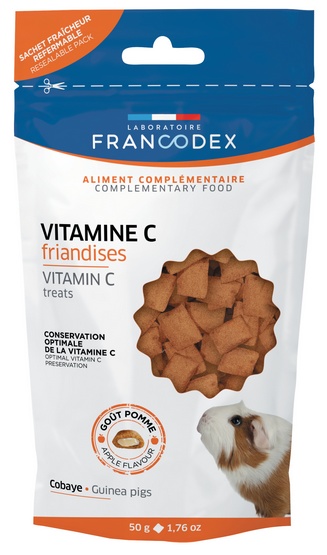 Przekąski z witaminą C FRANCODEX są oryginalnym sposobem na podawanie świnkom morskim codziennej dawki witaminy C. Mogą być używane jako główne źródło witaminy C lub jako suplementacja innego źródła witaminy C (napój, świeże rośliny, tabletki itp.). Codzienne zapotrzebowanie zdrowych świnek morskich na witaminę C wynosi 20 mg/kg. Zapotrzebowanie to wzrasta trzykrotnie podczas choroby, rekonwalescencji, ciąży i laktacji (60 mg/kg).
