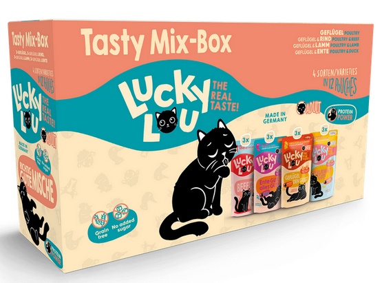 Gdzie indziej jest nudne standardowe jedzenie – Lucky Lou jest dostępne w 18 różnych odmianach smakowych w saszetkach 125 g oraz w puszkach 200 g i 400 g. Karma produkowana w Niemczech.