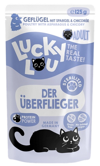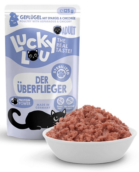 Gdzie indziej jest nudne standardowe jedzenie – Lucky Lou jest dostępne w 18 różnych odmianach smakowych w saszetkach 125 g oraz w puszkach 200 g i 400 g. Karma produkowana w Niemczech.
