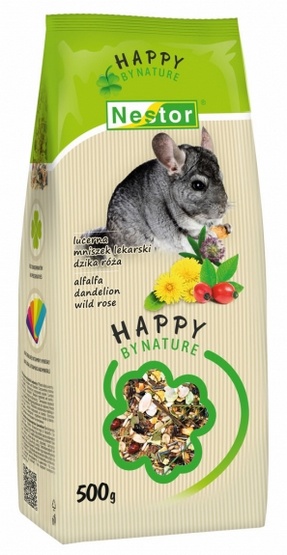 HAPPY BY NATURE – idealnie dopasowany i zbilansowany pokarm klasy PREMIUM z lucerną, mniszkiem lekarskim i dziką różą, został specjalnie przygotowany z myślą o szynszylach. Mieszanka pozbawiona sztucznych składników, barwników, konserwantów, starannie dobrana zgodnie z potrzebami i wymaganiami żywieniowymi szynszyli, z siłą płynącą wprost z serca natury wspomaga ich zdrowie, kondycję i dobre samopoczucie.