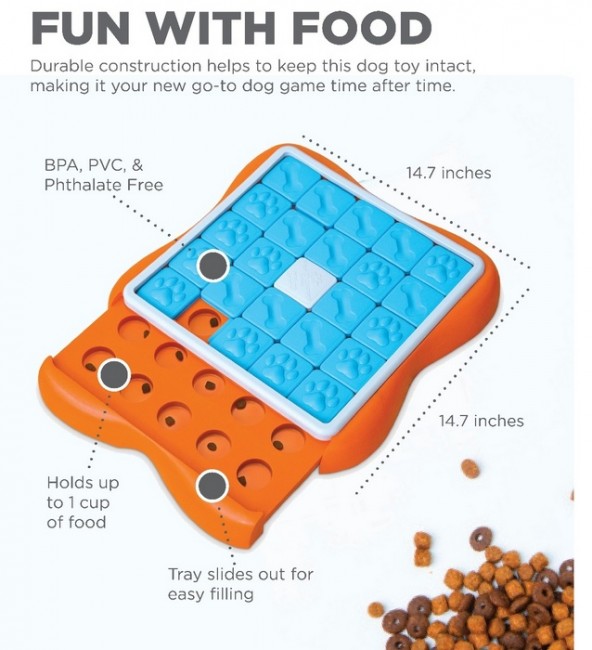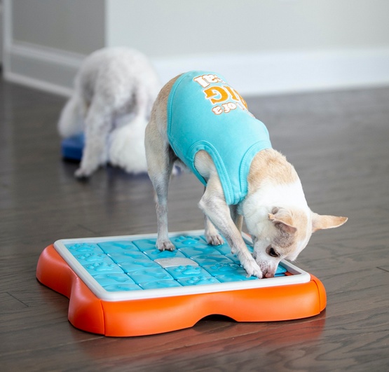 Węsząc i pomagając sobie łapą lub pyszczkiem pies natrafi na przegródki, które będzie musiał odblokować, zanim sięgnie po ukryte w nich łakocie. System blokady polega na przesuwaniu ruchomych płytek znajdujących się na wierzchu zabawki. Sprawdź czy Twój czworonóg jest geniuszem!