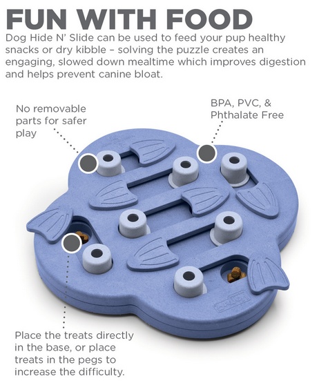 Gra Hide 'N Slide zachęca do swobodnej zabawy w poszukiwanie smakołyków! Zacznij od napełnienia przegródek przysmakami lub suchą karmą. Potem zachęć pupila do eksploracji zabawki.