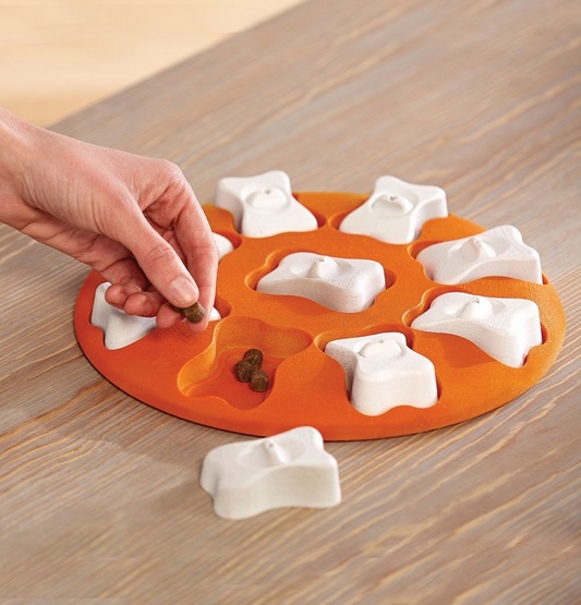 Węsząc i zdejmując łapami lub pyszczkiem kosteczki skrywające łakocie, twój czworonóg szybko nauczy się odnajdywać ukryte skarby!