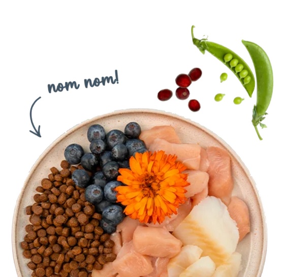 świeże mięso z kurczaka (20 %), jęczmień, kukurydza, białko drobiowe (suszone), białko kukurydziane, tłuszcz zwierzęcy, świeży pstrąg (5 %), hydrolizat białka, siemię lniane, węglan wapnia, ryż, mączka wątrobowa, olej z łososia (0.5 %), groch (suszony, 0.4 %), chlorek potasu, borówka brusznica (suszona, 0.1 %), jagody (suszone, 0.1 %), suszona pietruszka (0.1 %), drożdże (suszone, 0.1 %), kwiaty nagietka (suszone, 0.05 %)