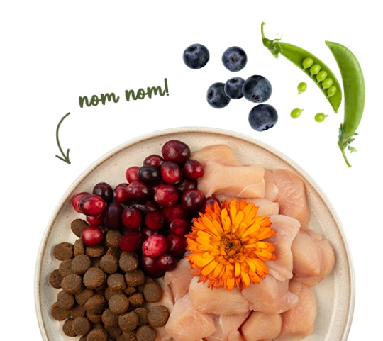 świeże mięso z kurczaka (20%), jęczmień, kukurydza, białko drobiowe (suszone), tłuszcz zwierzęcy, hydrolizat białka, białko kukurydziane, mąka ryżowa, groch (suszony, 0.8%), mączka wątrobowa, węglan wapnia, olej z łososia (0.5%), chlorek potasu, borówka brusznica (suszona, 0.1%), jagody (suszone, 0.1%), suszona pietruszka (0.1%), drożdże (suszone, 0.1%), kwiaty nagietka (suszone, 0.05%).