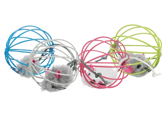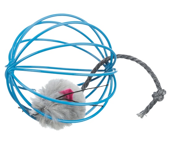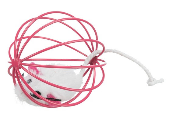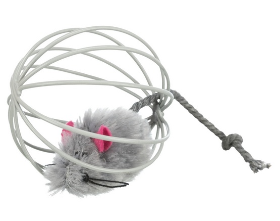 Zabawka dla kota – pluszowa myszka w drucianej piłce.