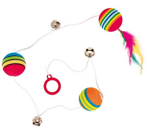Zabawka dla kotów w postaci kolorowych piłeczek połączonych z piórkiem i dzwoneczkami.