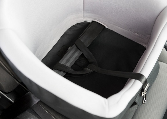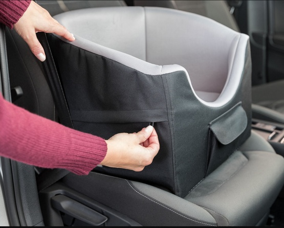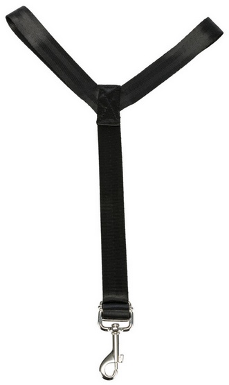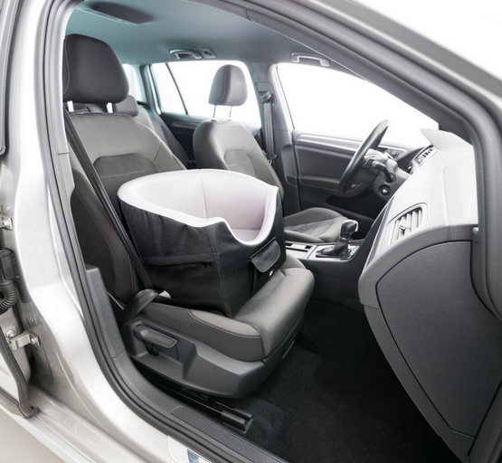 Uwaga: Siedzisko i zintegrowana krótka smycz są przymocowane do siedzenia za pomocą pasa samochodowego. Nie zapewnia to bezpieczeństwa ani zwierzęciu, ani pasażerom, ale zapobiega przewróceniu się lub ześlizgnięciu z fotela samochodowego. Pies podczas jazdy zawsze powinien być przypięty za pomocą specjalnej uprzęży bezpieczeństwa, która będzie przymocowana do zintegrowanej krótkiej smyczy.
