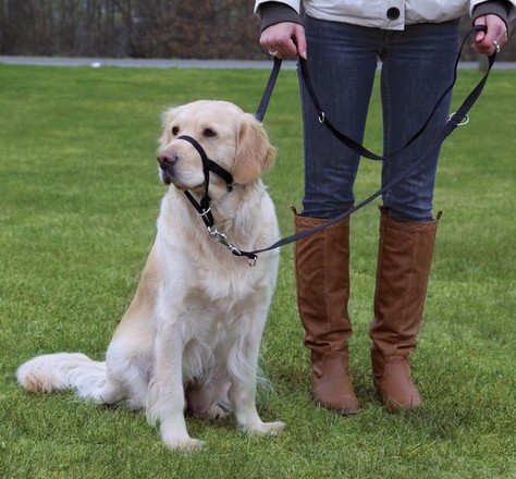 - Zabezpiecza przed pogryzieniem jeśli jest ciasno zapięta. Można ją poluzować i wtedy pies swobodnie otwiera pysk. Pod pyskiem znajduje się metalowe kółeczko do którego można przypiąć smycz gdy pies mocno ciągnie właściciela, wtedy działa jak typowy kantar.