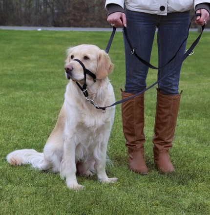 - Zabezpiecza przed pogryzieniem jeśli jest ciasno zapięta. Można ją poluzować i wtedy pies swobodnie otwiera pysk. Pod pyskiem znajduje się metalowe kółeczko do którego można przypiąć smycz gdy pies mocno ciągnie właściciela, wtedy działa jak typowy kantar.