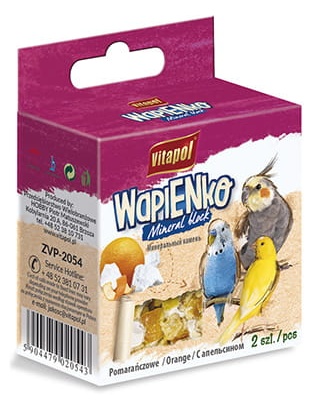 Niezastąpiony suplement ptasiej diety. Wapno jest podstawowym składnikiem budulcowym kośćca, niedobór prowadzi do niedorozwoju i krzywizny, a u starszych ptaków do osłabienia kości i ich łamliwości. Wapń jest również niezbędny do budowy skorupek ptasich jaj w trakcie lęgów oraz w okresie pierzenia. Wapienko zostało dodatkowo wzbogacone pomarańczą, co czyni ją bardziej atrakcyjną i smakowitą.